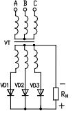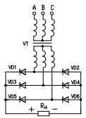 Диоды VD1,VD3, VD5 мостового выпрямителя образуют одну группу, а диоды VD2, VD4 и VD6 другую. Общие точки диодов первой группы образуют положительный полюс на нагрузке RH, а общая точка второй группы – отрицательный полюс.