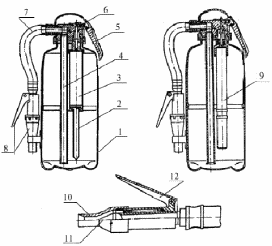 Огнетушители порошковые унифицированные (универсальные) ОПУ-5-01 и ОПУ-10-04 (Рис. 8.4.3.) состоят из корпуса, наполненного огнетушащим порошком. Могут поступать с газогенерирующим устройством поз.9, или с баллоном для сжатого газа поз.2. Внутри огнетушителя расположена сифонная трубка -4, снаружи - рукоятка запуска 5.