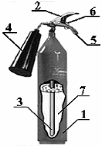 Огнетуитель состоит из корпуса 1, наполненного огнетушащим порошком. На горловине корпуса посредством накидной гайки закреплена головка 6 с бойком. На головку установлен: источник газа — ИХГ