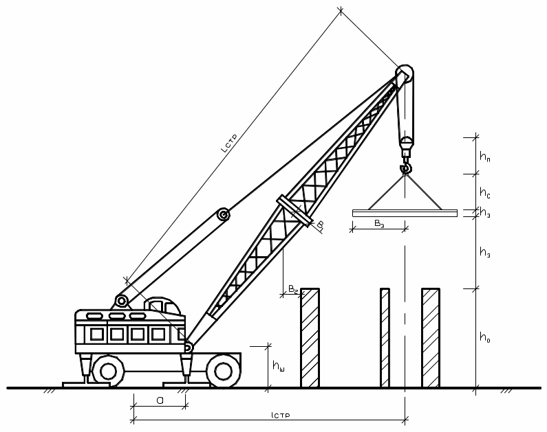 При выборе самоходного стрелового крана необходимо учитывать, что длинна наклонно расположенной стрелы и вылет крюка зависят так же и от допустимого приближения стрелы к монтируемого элементу.