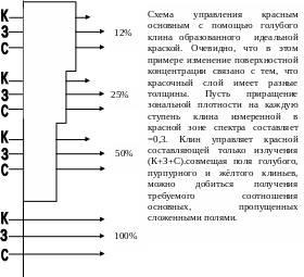Рассмотренный выше синтез реальными красками осложняется рядом явлений из которых набольшее значение имеет светорассеяние в красочном слое. Связь монохроматической плотности, измеренной в максимуме поглощения каждой из красок, с поверхностной концентрацией имеет следующий вид: