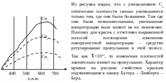 Отклонения от закона Бугера – Ламберта – Бера связаны со светорассеянием в красочном слое. Сущность явления состоит в том, что свет проходя через частицы пигмента краски окрашивается так как эти частицы выполняют роль светофильтров. Они работают не только на пропускание, но и на отражение, имея иной показатель преломления, чем связующее.