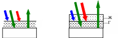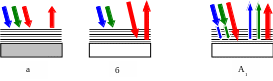 В первом случае излучение проходит через краску один раз, а во втором дважды: сначала проникает через краску к бумаге отражается от неё и вновь выходит через красочный слой. Краска наложенная на бумагу, уменьшает её коэффициент отражения. Рассматривая систему «бумага краска» принято говорить о коэффициенте отражения краски, хотя на самом деле отражает бумага.