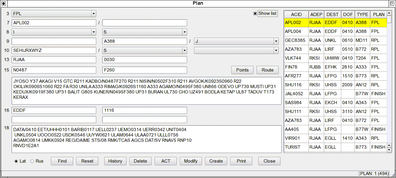 Окно Plan предназначено для ввода нового плана полета, поиска плана по введенным критериям и просмотра конкретного плана полета, модификации при изменениях маршрута полета, активизации и отмены плана полета.