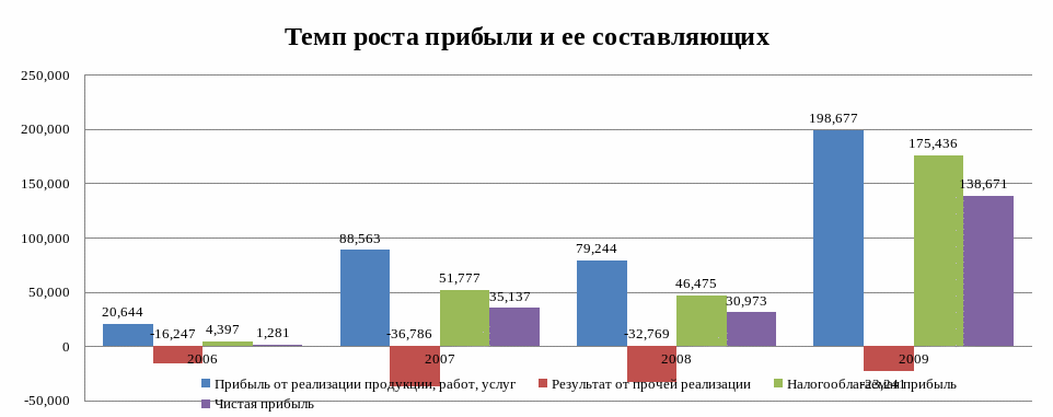 Темпы роста всех показателей имеют максимальное значение в 2009 году, что говорит о “подъеме предприятия”. Налогооблагаемая прибыль, объем реализации, и средняя величина активов имеет тенденции к приросту. При этом темп роста прибыли больше чем темп роста объемов реализации, а темп роста объемов производства больше чем темп роста средней величины активов. Это является положительным моментом в деятельности организации.