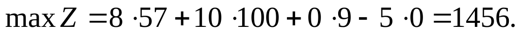 Отже, оптимальним є виробництво 57 одиниць продукції А, 100 одиниць продукції В і 9 одиниць продукції С. Тоді прибуток буде найбільшим і становитиме 1456 грн.