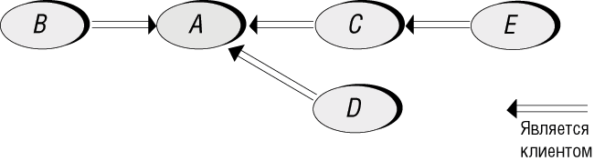 Два рисунка, приведенные ниже, иллюстрируют ситуацию, в которой трудно согласовать потребности в открытых и закрытых состояниях модуля. На первом рисунке модуль A используется модулями-клиентами B, С, D, которые сами могут иметь своих клиентов - E, F и так далее.