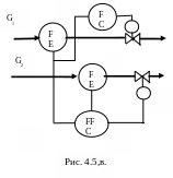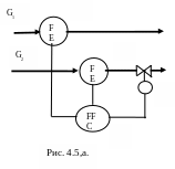 При заданном «ведущем» расходе кроме АСР соотношения применяют и АСР «ведущего» расхода (рис. 4.5,в). При такой схеме в случае изменения задания по расходу G1 автоматически изменится и расход G2 (в заданном соотношении с G1).