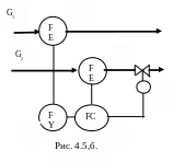 При незаданной общей производительности расход одного вещества (рис. 4.5,a) G1 называемый «ведущим», может меняться произвольно; второе вещество подается при постоянном соотношении с первым, так что «ведомый» расход равен G1. Иногда вместо регулятора соотношения используют реле соотношения и обычный регулятор для одной переменной (рис. 4.5,6). Выходной сигнал реле 6, устанавливающего заданный коэффициент соотношения , подается в виде задания регулятору , обеспечивающему поддержание «ведомого» расхода.