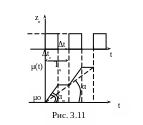 При наличии импульса управляющее воздействие изменяется с постоянной скоростью равной 100/ТМ, т.е. =(100/TM)* tи. На рис. 3.11 tg(αM) определяется конструктивной скоростью ИМ. За время паузы управляющее устройство остается постоянным. Средняя скорость за время цикла будет равна ` = /(tи + tп), или ` = (100/TM)* tи./(tи + tп), или ` = tg(αM)*(tи/Тц). Следует отметить, что максимальная скорость исполнительного устройства ограничена его конструктивной скоростью.