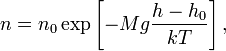 где p — давление газа в слое, расположенном на высоте h, p0 — давление на нулевом уровне (h = h0), M — молярная масса газа, R — газовая постоянная, T — абсолютная температура. Из барометрической формулы следует, что концентрация молекул n (или плотность газа) убывает с высотой по тому же закону: