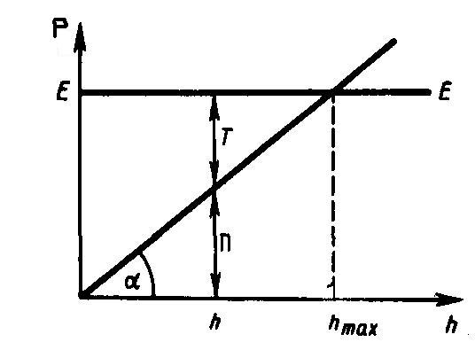 Будем исследовать одномерное движение тела, при этом его потенциальная энергия является функцией лишь одной переменной (чаще всего функции координаты х), т. е. P=P(х). График зависимости потенциальной энергии от данного аргумента называется потенциальной кривой. Исследование потенциальных кривых дает возможность определить характер движения тела. В этом разделе мы рассматриваем только консервативные системы - системы, в которых отсутствуют взаимные превращения механической энергии в другие виды. Тогда справедлив закон сохранения энергии. Будем рассматривать графическое представление потенциальной энергии тела, находящегося в однородном поле тяжести и для тела, подвергающегося упругим деформациям. Потенциальная энергия тела массой m, находящегося на высоте h над поверхностью Земли: P(h)=mgh. Потенциальная кривая в этом случае: P=P(h) - прямая линия, проходящая через начало координат (рис. 1), тангес угла наклона которой к оси h: tgα=mg. Значит, чем больше масса тела, тем больше α.