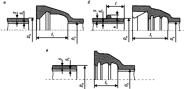 а - соединение под универсальное резиновое кольцо; б - соединение ВРС; в - соединение ВР