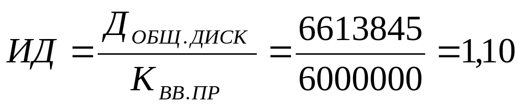 Общий дисконтируемый доход составит 6613845 руб., а индекс доходности - 1,10, это свидетельствует, что на каждый вложенный рубль предприятие получит прибыль в размере 1,10 руб.