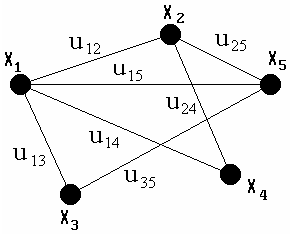 Пример изображения графа G, состоящего из множества вершин X = {x1, x2, x3, x4, x5} и множества рёбер U = {u12, u13, u14, u15, u24, u25, u35} представлен на рис. 3. 9.