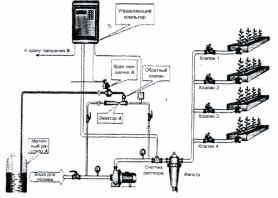 Система краплинного поливу призначена для подачі в заданий час і в необхідній кількості води і добрив в кореневу зону кожної рослини в теплицях площею 1 ...3 га. Система включає вузол розчину і розподільну мережу.