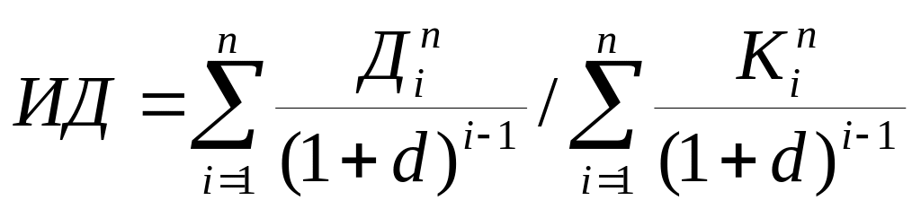 Индекс доходности (ИД), или индекс рентабельности, соответствует показателю Profitability Index (PI) – это отношение суммарного дисконтированного дохода к суммарным дисконтированным затратам (капитальным вложениям):