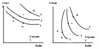 Казалось бы в этой ситуации торговля между странами становится совершенно невозможной. Но все же страны продолжают торговать между собой и извлекать из этой торговли очевидную выгоду. В чем дело? Оказывается внутренние издержки производства одного товара, выраженные в издержках на производство второго товара, в каждой из них разные. Это позволяет формировать и разные внутренние альтернативные цены на пшеницу и уголь.