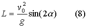 Применение формул (2) и (3) для описания движения тела, брошенного под углом к горизонту из начала координат с начальной скоростью v0, лежащей в плоскости {xOy}, приводит к следующим общеизвестным соотношениям: