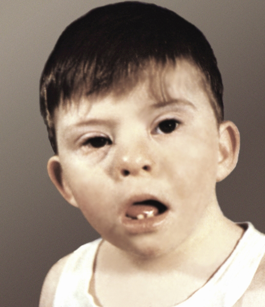 У этих детей наблюдается также микроцефалия, микрогения, лунообразное лицо с уменьшенной верхней челюстью и складками в уголках глаз, высокое нёбо, плоская спинка носа, низко расположенные деформированные уши, гипертелоризм, антимонголоидное направление глазных щелей, эпикант, поперечная складка на ладони.