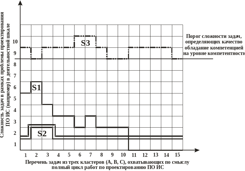 Обладать компетенцией инженера можно на разном качественном уровне, т.е. можно обладать знаниями и иметь развитые способности достаточные только для решения несложных задач, а можно обладать знаниями и иметь развитые способности достаточные для решения самых сложных профессиональных задач. На рис. 4.3. приведены профили S1, S2, S3 трех инженеров. При этом инженер S1 не обладает компетенцией (обладает только частью компетенции); S2 – обладает компетенцией инженера, но не компетентен; S3 – компетентный инженер.