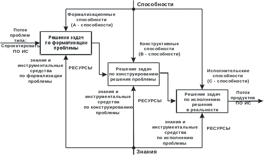 Рассмотрим внутреннюю деятельность инженера на фоне внешней деятельности по ходу процессе решения проблемы проектирование ПО ИС, которая сводится к решению комплекса взаимосвязанных задач (рис. 4.1). Условно разделим множество задач на три кластера задач, т.е. кластер задачи посвященных формализации проблемы (кластер задач типа А); кластер задач, посвященных конструированию решения проблемы (кластер задач типа В) и кластер задач, посвященных исполнению решения проблемы (кластер типа С).