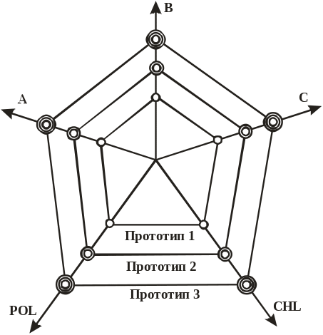 Обладание способностями со значениями параметров А, В, С, POL, CHL, характеризующих уровни развития формализационных (А), конструктивных (В) и исполнительских (С) способностей и объемы необходимых знаний-фактов (параметр POL) и знаний-связей (параметр CHL) дают возможность на практике реализовать инженеру соответственно прототип 1, прототип 2, прототип 3 и т.д.