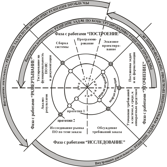 На фоне четырех фаз во внешней деятельности инженера при создании ПО ИС можно выделить три фазы работы во внутренней деятельности: