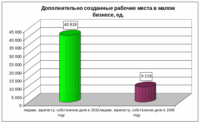 1. Открыли собственное дело на субсидию в 58,8 тыс рублей по программе самозанятости 173,0 тыс. безработных. Они создали 58,2 тыс. дополнительных рабочих мест для безработных (48,0 тыс. мест создано открывшими бизнес в 2010 году, 10,2 тыс. – в 2009 году. Из них в малом бизнесе в 2010 г. было создано 40,819 рабочих мест, в 2009 г. – 9,216) (диаграмма 2). Фактические расходы по данному направлению составили 13,5 млрд рублей.