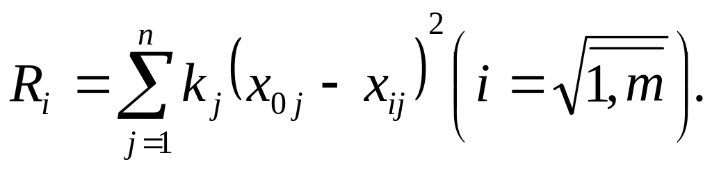Оценка Ri каждого i-ого подразделения вычисляется как квадрат расстояний между двумя точками в m-мерном пространстве, координаты первой – это значения показателей подразделения-эталона, а координаты второй – показатели подразделений i.