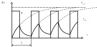 Повторно-кратковременный режим (рис. 1.2 в) - При повторно-кратковременном режиме работы (ПКР) электроприемника кратковременные рабочие периоды с определенной нагрузкой чередуются с паузами (ЭП отключен). Продолжительность рабочих периодов и пауз не настолько велика, чтобы нагрев отдельных частей ЭП при неизменной температуре окружающей среды могли достигнуть установившихся значений.