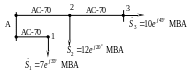 Районная сеть, схема которой приведена на рисунке, позволяет передать электроэнергию от источника А к электроприемникам 1, 2, 3, расчетная мощность которых приведена на рисунке и выражена в МВА. Необходимо определить напряжение в узловых точках и мощность, отбираемую от источника, если U3 = 106,7 кВ.