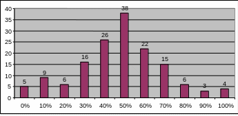 2) Отметьте, пожалуйста, по шкале, в какой степени Вы удовлетворены своим трудом (в процентах). Полученные данные, представим в виде диаграммы (рис. 2.).