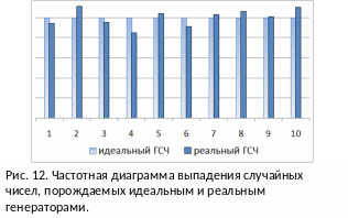 За эталон генератора случайных чисел (ГСЧ) принят такой генератор, который порождает последовательность случайных чисел с равномерным законом распределения. Если наблюдать такой ГСЧ достаточно длительное время, то окажется, что в каждый из десяти, например, интервалов (0;0.1), (0.1;0.2), …, (0.9;1) попадет одинаковое количество случайных чисел (рис. 12).