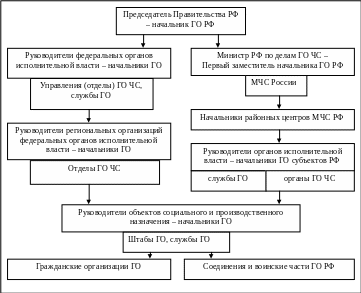 Общее руководство ГО РФ осуществляет Председатель Правительства РФ. Он является начальником гражданской обороны РФ, а Министр по делам гражданской обороны, чрезвычайным ситуациям и ликвидации последствий стихийных бедствий (МЧС) – первым заместителем начальника ГО РФ.