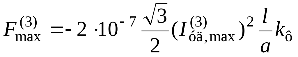 Наибольшие электродинамические силы действуют на среднюю фазу (расположение шин в одной плоскости) при трехфазном КЗ и поэтому принимаются за расчетные: