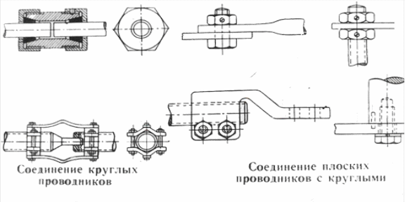 Неразмыкаемые контактные соединения (рис. 3.8)выполняют в виде болтовых соединений, винтовых зажимов, обычной и холодной сварки (прессования). Их применяют для соединения медных и алюминиевых шин, проводов, присоединений аппаратов. В неразмыкаемых болтовых контактных соединениях термическое действие вследствие теплового расширения создает дополнительное напряжение в материале болтов, которое, складываясь с напряжением затяжки болта, может привести к остаточным деформациям и ослаблению контактного соединения. Поэтому контактные соединения такого типа проверяют на допустимость упомянутых дополнительных напряжений и в каждом случае регламентируют затяжку болтовых соединений