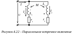 Предположим, что две индуктивно связанные катушки соединены параллельно. Их параметры соответственно равны: активные сопротивления r1 и r2, индуктивности L1 и L2 и взаимной индуктивностью М. Возможны два вида их соединения – согласное и встречное.