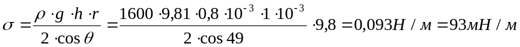 Задача 15.2(5) Определить коэффициент поверхностного натяжения ϭ пластовой воды на границе с углеводородным газом, если в капилляре с диаметром d=2 мм, она поднимается на высоту h=0,8 мм. Плотность жидкости ρ=1,6 г/см3, краевой угол избирательного смачивания θ=49 град.