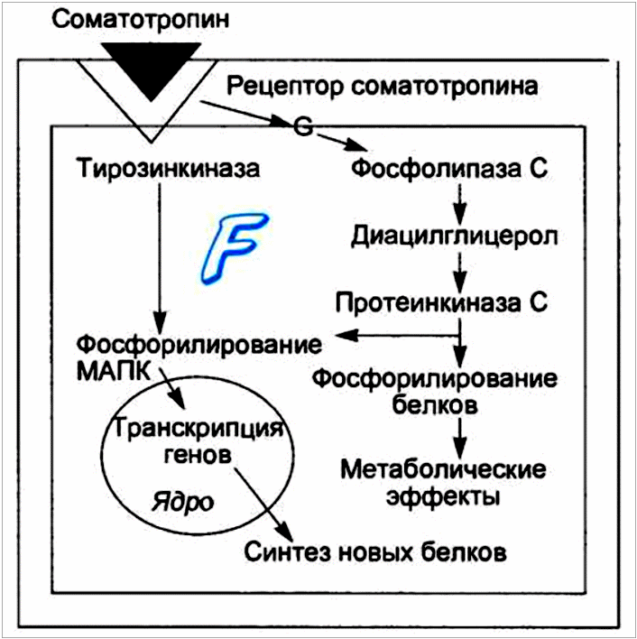Гормон роста(соматотропин) — один из гормонов передней доли гипофиза. Относится к семейству полипептидных гормонов.У молодых людей с ещё не закрывшимися зонами роста в костях он вызывает выраженное ускорение линейного (в длину) роста, в основном за счет роста длинных трубчатых костей конечностей;оказывает мощное анаболическое и антикатаболическое действие, усиливает синтез белка и тормозит его распад;способствует снижению отложения подкожного жира, усилению сгорания жира; иммуностимулирующий эффект, усиление поглощения кальция костной тканью;