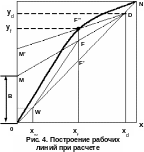 Для построения рабочих линий на оси абсцисс откладывают значения хw, хf и хd, проводят через них вертикали хw W, хf F и хd D. Согласно принятому флегмовому числу на оси ординат откладывают отрезок ОМ = В = хd/(R+1). Точку М соединяют прямой с точкой D, лежащей на пересечении вертикали хdD с диагональю диаграммы. Точку F пересечения этой прямой W с вертикалью хf F соединяют с точкой W пересечения вертикали Xw с диагональю. Отрезок FD - рабочая линия укрепляющей части колонны, а отрезок FW - рабочая линия исчерпывающей части колонны.