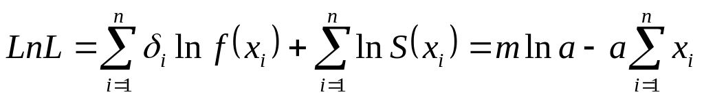 где , если наблюдение нецензурировано, , если наблюдение цензурировано, m – число нецензурированных наблюдений (случаев). Необходимым условием максимума выражения (3.4) является равенство нулю первых частных производных LnL по a и по k