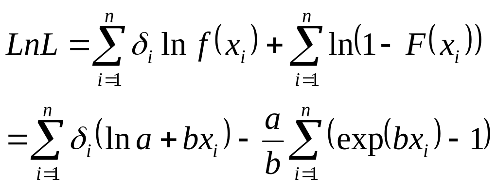 где , если наблюдение нецензурировано, , если наблюдение цензурировано. Необходимым условием максимума выражения (3.7) является равенство нулю первых частных производных LnL по a и по b