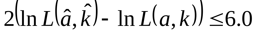 Для построения доверительной области значений параметров модели Гомпертца используется метод построения поверхности логарифма правдоподобия. Этот метод основан на том, что при большом числе наблюдений случайная величина имеет распределение с двумя степенями свободы. Из свойств распределения следует, что с вероятностью 0.95 справедливо неравенство .
