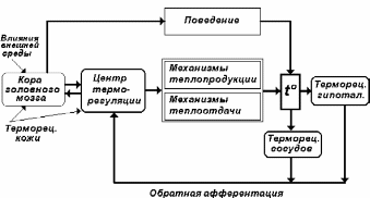 Самые незначительные сдвиги температуры крови немедленно воспринимаются терморецепторами в кровеносных сосудах (синокаротидная область и др.), в различных внутренних органах (желудок, кишечник и др.). Вместе с тем, наибольший интерес вызывают терморецепторы самого терморегуляторного центра. Они представляют собой особые термочувствительные нейроны, импульсная активность которых зависит от температуры поступающей в гипоталамическую область крови. Описаны термочувствительные нейроны, преимущественно возбуждающиеся при повышении температуры крови - тепловые термосенсоры, активирующие центральные механизмы теплоотдачи и оказывающие тормозящее влияние на центр теплопродукции. Выявлены термочувствительные нейроны, возбуждающиеся при снижении температуры крови - холодовые термосенсоры, активирующие механизмы защиты от холода - механизмы теплопродукции и оказывающие тормозящее влияние на центр теплоотдачи. Центральные тепловые и холодовые термосенсоры являются основными рецепторами, фиксирующими отклонения регулируемой температуры крови, перфузирующей ЦНС, от эталонного значения. Величина отклонения кодируется в форме импульсного потока определенной частоты, поступающего к эффекторным нейронам гипоталамического терморегуляторного центра.