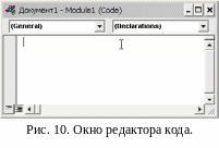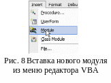 Выберите команды Insert -> Module в меню редактора Visual Basic (Error: Reference source not found), или, нажав на соответствующем проекте в менеджере проектов правой кнопкой мыши, выберете соответствующие команды в контекстном меню (Error: Reference source not found). Редактор добавит новый модуль в проект и откроет окно Редактора кода (Error: Reference source not found) созданного модуля, в котором можно написать программу.