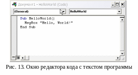 Введите следующие строки: Sub HelloWorld () MsgBox "Hello, World!" End Sub На экране это будет выглядеть примерно так: (Error: Reference source not found):