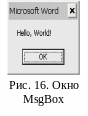 о команде MsgBox "Hello, World!" в программе будет выведено окно, содержащее выводимый текст (Error: Reference source not found).