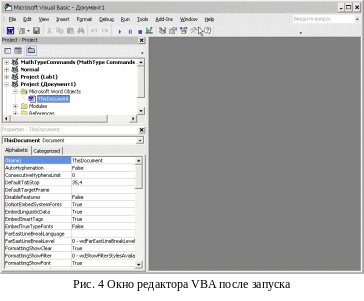 В редакторе Visual Basic при запуске отображается окно Менеджера проектов и окно Свойств объектов (Error: Reference source not found).