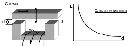 МП, созданный w1, индуктирует в w2 ЭДС, которая измеряется. Значение МП, следовательно, ЭДС, зависит от воздушного зазора.